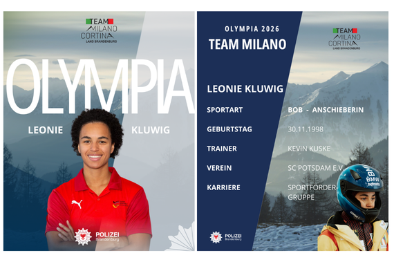 (06.02.2026) Wenn am 6. Februar die Olympischen Spiele in Mailand, Italien, beginnen, richtet sich der Blick der Polizei Brandenburg auf zwei ganz besondere Teilnehmende: Leonie Kluwig und Oliver Peschk werden im Olympia-Team der deutschen Bobfahrer auf eine Medaille für ihre Teams hoffen; Leonie in der Kategorie Zweierbob Frauen, Oliver in der Kategorie Viererbob Männer. Das Besondere an den beiden Anschiebern ist, dass sie Mitglieder unserer Sportfördergruppe sind und damit nicht nur Deutschland sowie Brandenburg vertreten, sondern auch unsere Landespolizei und die Hochschule.