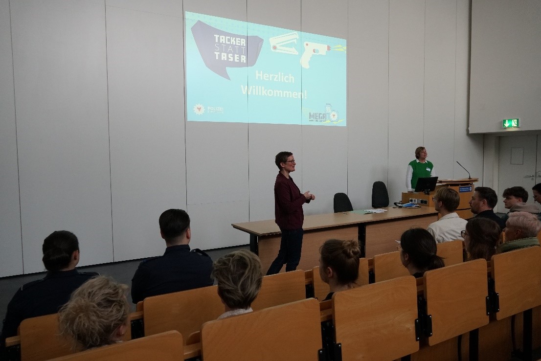 (03.03.2026) Am 18. Februar 2026 fand die bereits mit Spannung erwartete Veranstaltung „Tacker statt Taser“ an der Hochschule der Polizei statt – und dieses Jahr war sie besonders interaktiv und praxisnah! Rund 60 Studierende aus den Studiengängen Öffentliche Verwaltung Brandenburg (ÖVBB) und Verwaltungsinformatik (VIBB) hatten die Gelegenheit, sich einen detaillierten Überblick über die vielseitigen Aufgaben der Hochschule und ihrer Verwaltung zu verschaffen. Ziel der Veranstaltung war es, den Studierenden nicht nur einen praktischen Eindruck von der HPol zu vermitteln, sondern sie auch von den beruflichen Perspektiven an der Hochschule zu überzeugen.