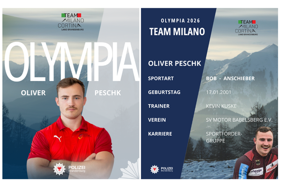 (06.02.2026) Wenn am 6. Februar die Olympischen Spiele in Mailand, Italien, beginnen, richtet sich der Blick der Polizei Brandenburg auf zwei ganz besondere Teilnehmende: Leonie Kluwig und Oliver Peschk werden im Olympia-Team der deutschen Bobfahrer auf eine Medaille für ihre Teams hoffen; Leonie in der Kategorie Zweierbob Frauen, Oliver in der Kategorie Viererbob Männer. Das Besondere an den beiden Anschiebern ist, dass sie Mitglieder unserer Sportfördergruppe sind und damit nicht nur Deutschland sowie Brandenburg vertreten, sondern auch unsere Landespolizei und die Hochschule.