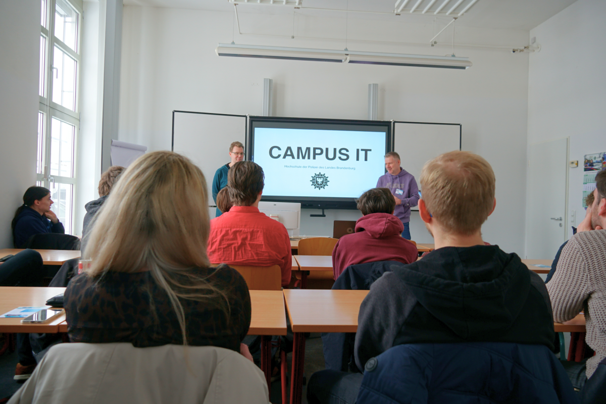 (03.03.2026) Am 18. Februar 2026 fand die bereits mit Spannung erwartete Veranstaltung „Tacker statt Taser“ an der Hochschule der Polizei statt – und dieses Jahr war sie besonders interaktiv und praxisnah! Rund 60 Studierende aus den Studiengängen Öffentliche Verwaltung Brandenburg (ÖVBB) und Verwaltungsinformatik (VIBB) hatten die Gelegenheit, sich einen detaillierten Überblick über die vielseitigen Aufgaben der Hochschule und ihrer Verwaltung zu verschaffen. Ziel der Veranstaltung war es, den Studierenden nicht nur einen praktischen Eindruck von der HPol zu vermitteln, sondern sie auch von den beruflichen Perspektiven an der Hochschule zu überzeugen.